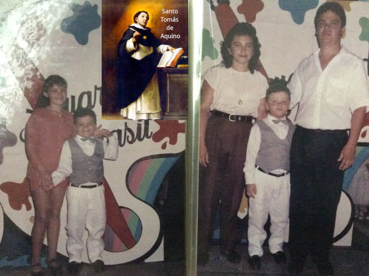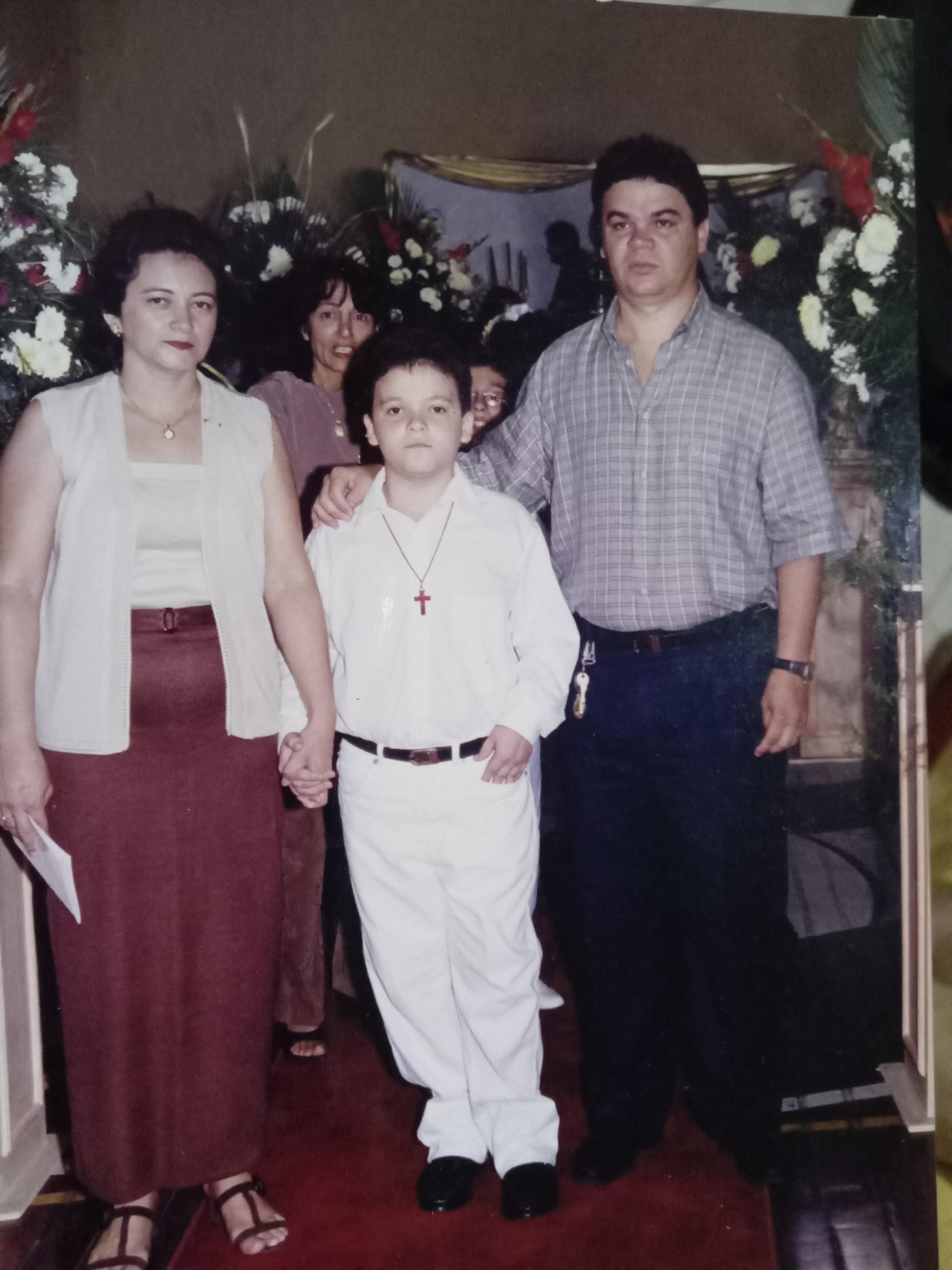 Foto na minha casa depois de receber minha Primeira Eucaristia. Eu e meus Padrinhos na foto. |